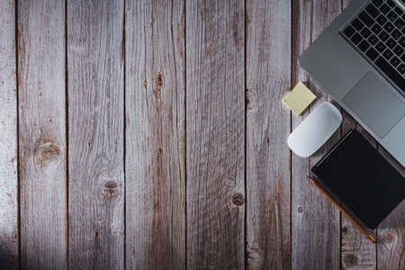 Above view simple workspace with laptop computer, notebook and coffee cup on wooden desk.