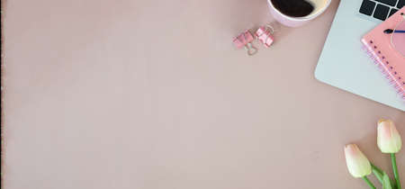 Woman workplace with laptop computer, coffee cup and notebook on pink background.