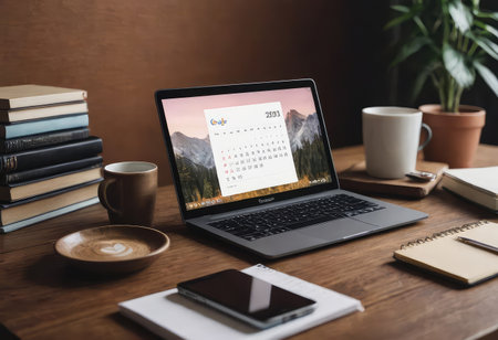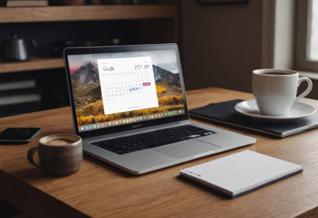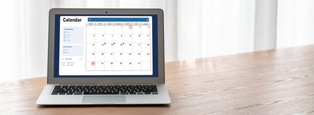 Business Planning with laptop and calendar for July, August, September. Empty calendar with computer notebook on a working table. Holiday planning.