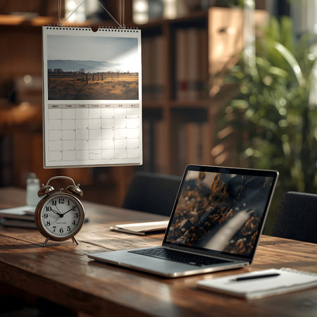 A desk calendar and pencil rest on a wooden surface near a window. The image displays a clean, minimalist style with soft lighting. The composition suggests planning, scheduling, or the passage of time. Suitable for commercial applications such as advertising or editorial content about organization.