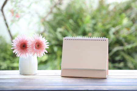 Empty calendar with white coffee cup and notebook on brown wooden table at outside