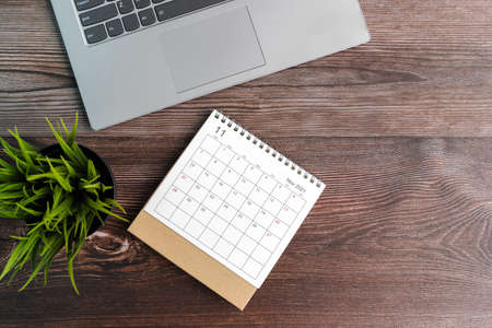 Office desk table with laptop and calendar. Top view with copy space