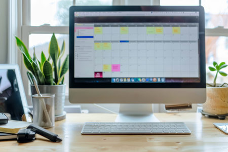 A well-organized weekly schedule is displayed on a bright computer screen. The home office setting reflects a focus on time management