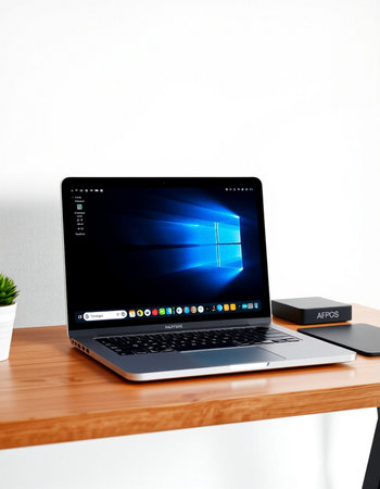 Laptop with blank screen on wooden desk with coffee cup and mouse