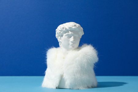 Antique statue is bust of David on blue background with his eyes closed. Concept of modern art and future vaporwave.