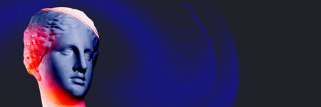 Colorful neon image with greek sculpture, surreal art style. Head of a statue David by Michelangelo. Copy space.