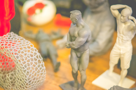 Objects form the body of a bodybuilder photopolymer printed on 3d printer. Stereolithography 3D printer, photopolymerization UV light. Progressive modern additive technology. 4.0 industrial revolution