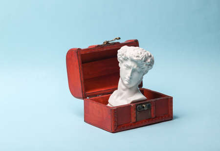 Antique Plaster David bust on blue background. concept pop. Minimal still life photography