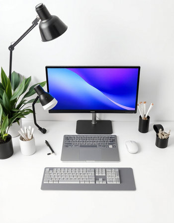 Modern workspace with computer monitor, keyboard, mouse, stationery and other items