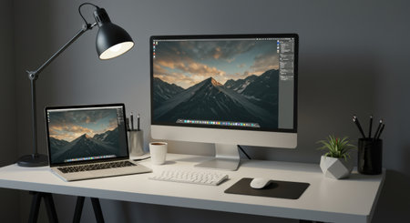 A modern, minimalist workspace featuring an iMac and MacBook displaying stunning mountain landscape wallpapers. Soft lighting enhances the calm atmosphere.