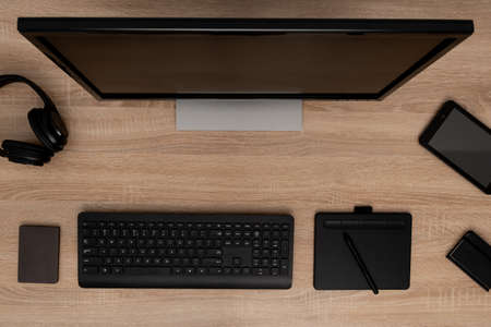 Top view of graphic designer desktop with laptop, digital graphic tablet, DSLR camera, wireless headphone and keyboard. 3D rendering image.