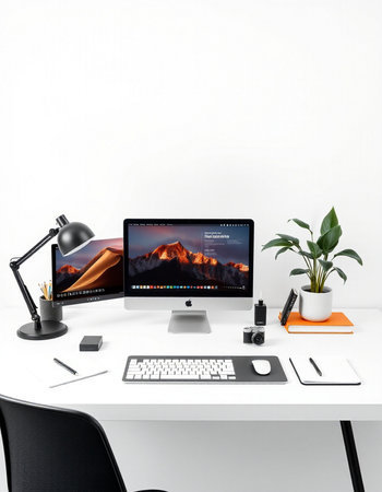 A stylish workspace showcases an iMac and MacBook alongside a smartphone, blending functionality with contemporary aesthetics.