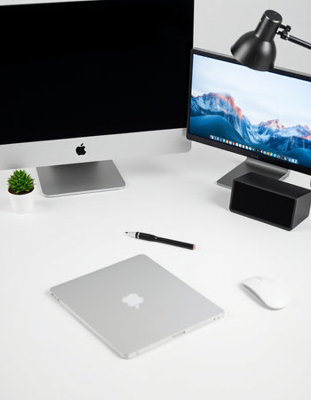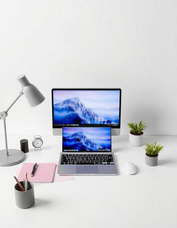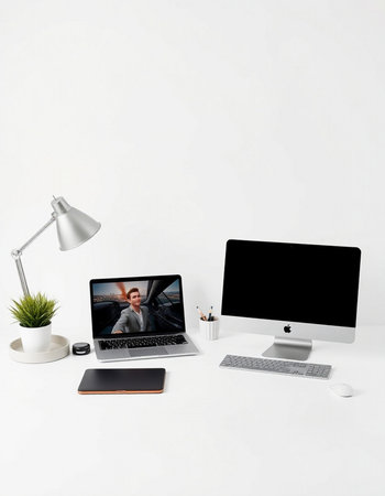 A minimalist workspace showcases a stylish desktop computer and a laptop on a clean, white surface, fostering inspiration and focus.