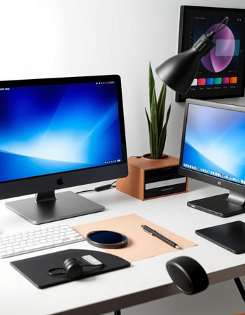 Bright and minimalist workspace featuring a computer, laptop, and phone, emphasizing a clean aesthetic and efficient workflow for creators.