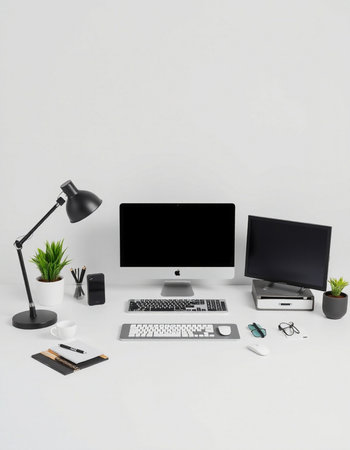 Modern workspace with computer monitor, keyboard, mouse, stationery and other items