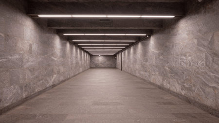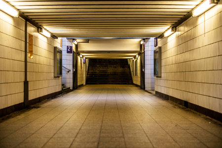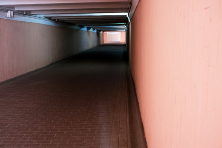 Dark urban underpass, long tunnel with marble walls, mobile street photo