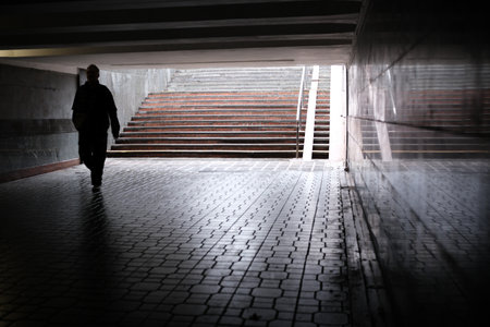 The silhouette of a man in the terrible mystical horror corridor of the basement with a paranormal ghostly light at the end of a dark tunnel with eerie shadows causing a feeling of fear