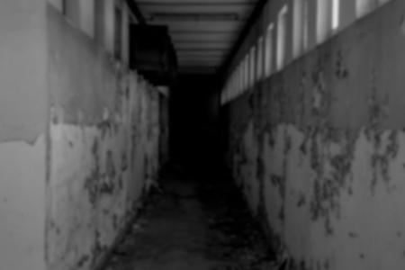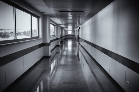 Blurred dark mysterious corridor in building. White wall perspective in lonely quiet building with light on black and white style. horror landscape concept.