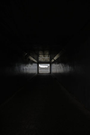 A lone figure walks through a dark tunnel toward a soft light outside.