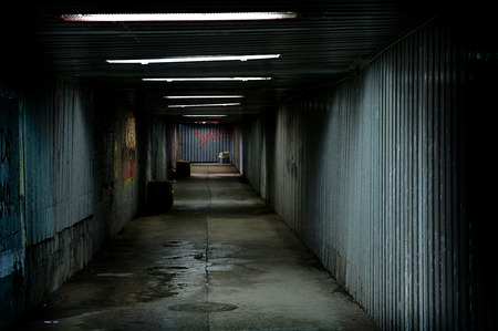 Long and dark underground passage, poorly illuminated with cold blue light, in Paris, France.