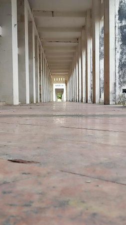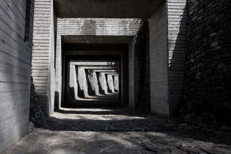 Tunnel of abandoned dirty Soviet bunker, echo of Cold War.