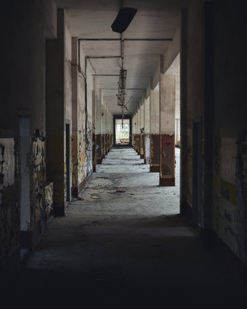 Dark scary corridor in abandoned industrial ruined brick factory, creepy interior, perspective toned