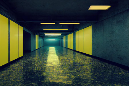 Long tunnel with mirrors in modern city architecture with low lights and grey colors with tile on the frloor