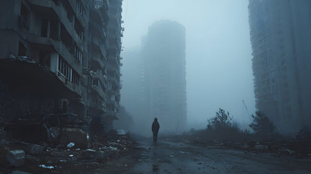 A lone survivor moves through a foggy, ruined city after an apocalyptic event. Great for storytelling, game design, and dramatic art.