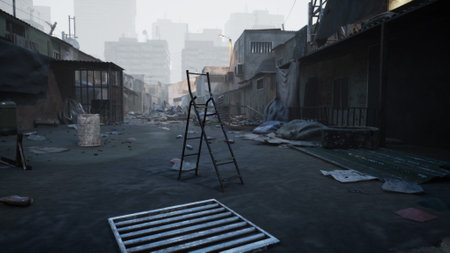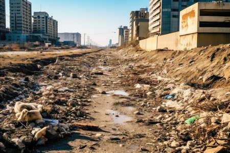 Realistic depiction of a street littered with waste, trash, and dust in a cinematic style