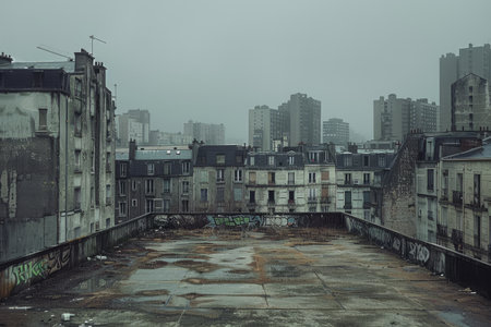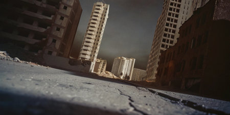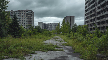 A haunting view of a desolate city with extensively damaged buildings under a dark, cloudy sky, creating an apocalyptic atmosphere in the ruins of an abandoned urban area. AI generated image