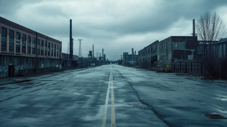 An abandoned industrial area stands ominously under a dark, cloud-filled sky, showcasing urban decay, desolation, and the haunting beauty of deserted structures. The atmosphere evokes a sense of mystery. AI generated image