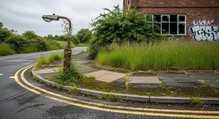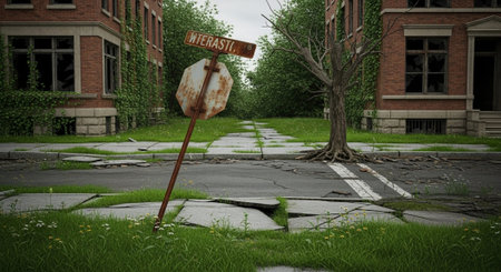 Small trees grow from cracks in the pavement, symbolizing resilience and nature's persistence. The early morning light casts a warm glow on storefronts in a quiet city street.