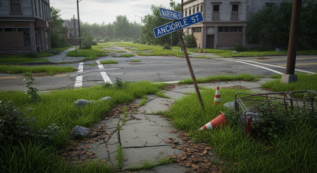 Cinematic depiction of a street overrun with trash and debris, highlighting urban decay and neglect