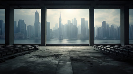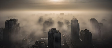 A dense, hazy fog obscuring tall buildings, with only faint outlines visible—representing air pollution and urban decay. Minimal pollution and environmental protection concept. Cop