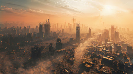 A desolate cityscape at sunset ruined buildings and piles of industrial debris under a hazy, orange-tinted sky, conveying a sense of post-apocalyptic devastation.