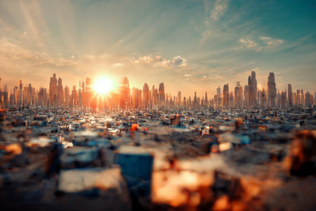Apocalyptic landscape with rubble and post apocalypse city at sunset