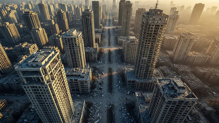 Structures showing extensive urban landscape of abandoned concrete buildings with skeletal structures and debris scattered across the desolate cityscape under a...