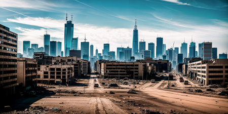 AI Generated. A post-apocalyptic cityscape with ruined skyscrapers and buildings under a bright blue sky with scattered white clouds