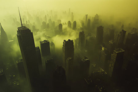 Thick yellow smog is engulfing a city skyline, creating a haunting and concerning environmental scene