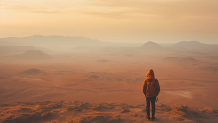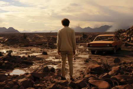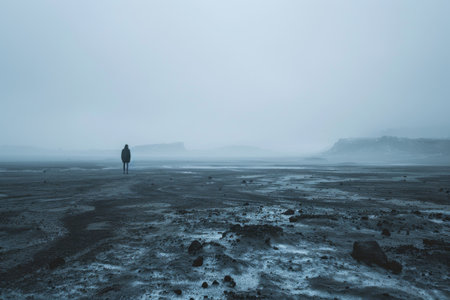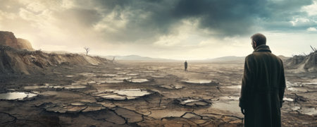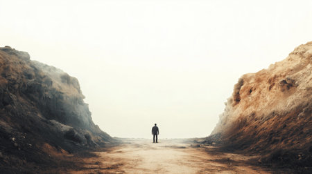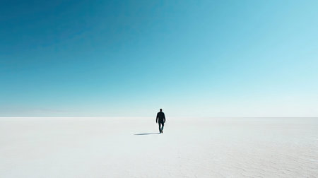 Generative AI : lonely man walking alone on the horizon line in an empty landsca