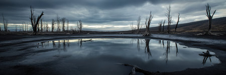 An oil lake sits at the center of a haunting landscape, encircled by stark, barren trees under a moody sky, creating an eerie atmosphere.