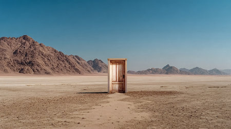 Wooden door standing alone in an arid desert landscape with mountains under a clear blue sky, presenting a symbolic concept of exploring new opportunities and potential paths forward
