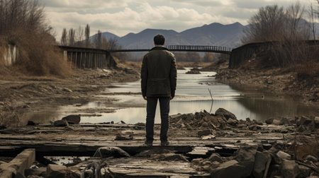 A man is standing in the middle of a road, looking off into the distance. The scene is desolate and quiet, with no other people or vehicles in sight. The man is lost in thought