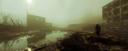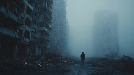 A lone survivor moves through a foggy, ruined city after an apocalyptic event. Great for storytelling, game design, and dramatic art.