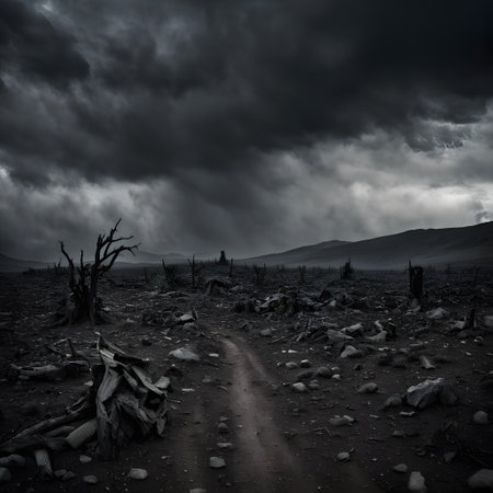This image captures a barren landscape with dead trees silhouetted against a smoky horizon, highlighting the drastic effects of climate change on nature and the environment.