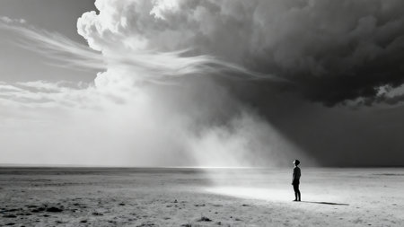 A grayscale shot of a lonely person walking on the beach under dark clouds