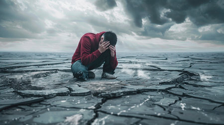 People sit with their heads down and hopeful in a dry land because of the drought there is no rain for a long time. Global warming and drought concept