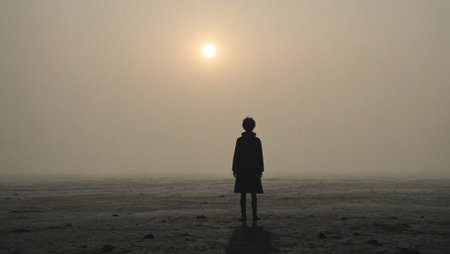 A solitary person in a dark coat stands still on a misty field, surrounded by tall grass and an eerie silence in the early hours of the day.