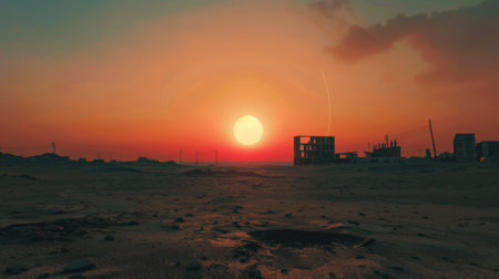 A desolate cityscape at sunset ruined buildings and piles of industrial debris under a hazy, orange-tinted sky, conveying a sense of post-apocalyptic devastation.