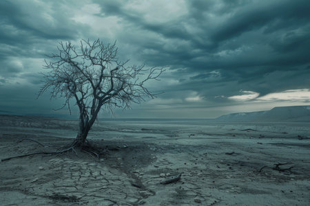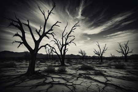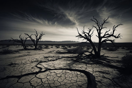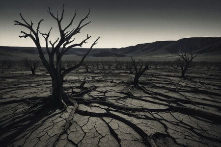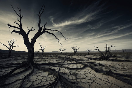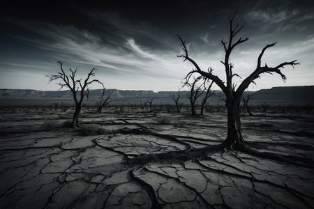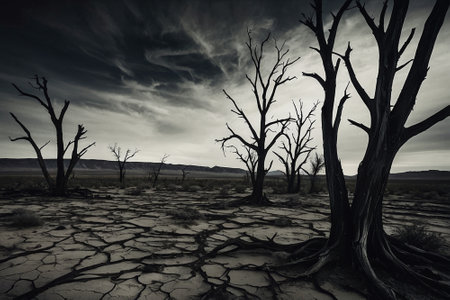 A barren landscape with cracked earth and wilted plants, symbolizing the impact of global warming